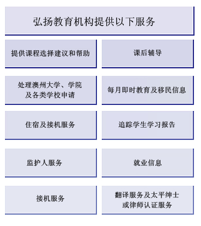 為了滿足您的需要、預算和要求, 弘揚提供個性化服務。所有的服務都有品質保證,這也反映在我們對澳大利亞教育機構的選擇上。